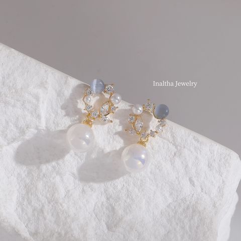 14K白金貝殼珍珠鋯石耳針/耳夾